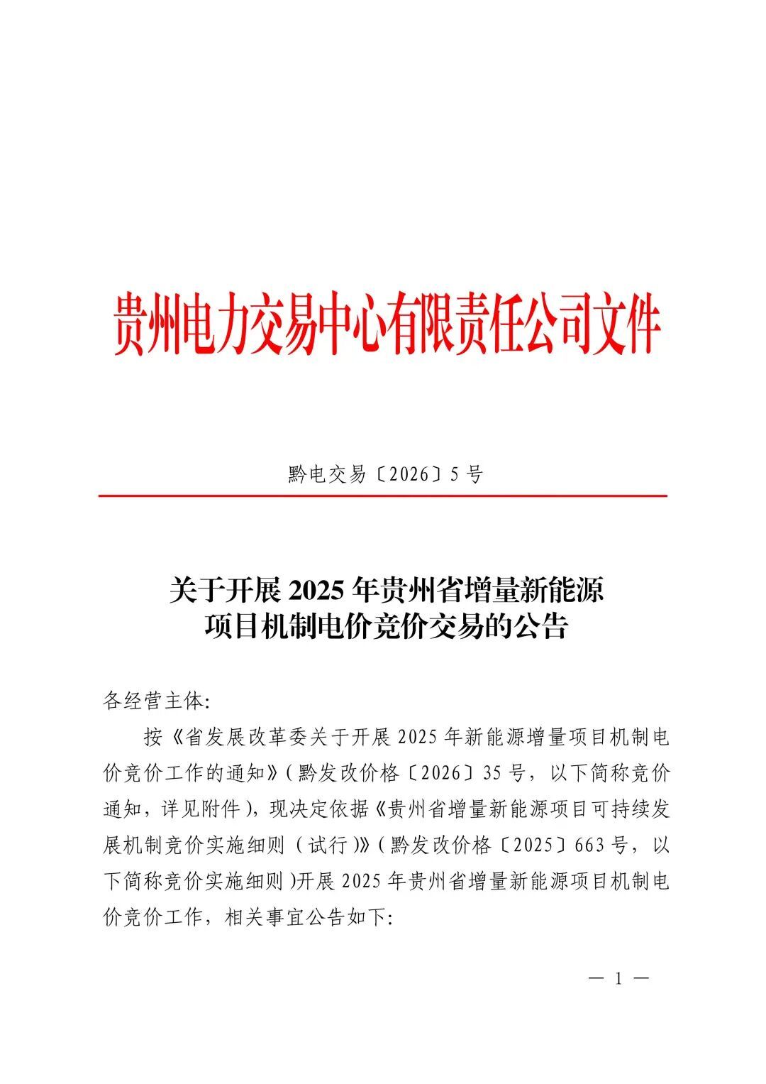 1月21日,贵州电力交易中心发布《关于开展2025年新能源增量项目机制电价竞价工作的通知》。