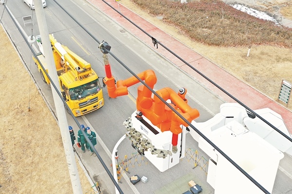 1月28日,在山东威海温泉镇,国网山东威海供电公司技术人员首次应用双臂自主带电作业机器人在10千伏寨南线地中海支2号杆完成带电加装接地环工作。在技术人员的远程监控下,机器人精准识别导线位置,用时15分钟灵活完成三相线路剥线、安装、紧固等系列动作。