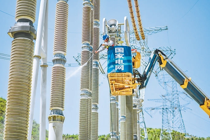 7月5日,在张北柔性直流电网工程延庆换流站,电力检修工人对设备进行清洁检修。邓伟 摄