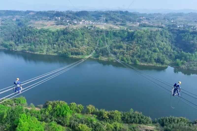 ▲国网重庆超高压公司员工开展哈密—重庆±800千伏特高压直流输电工程重庆段走线验收