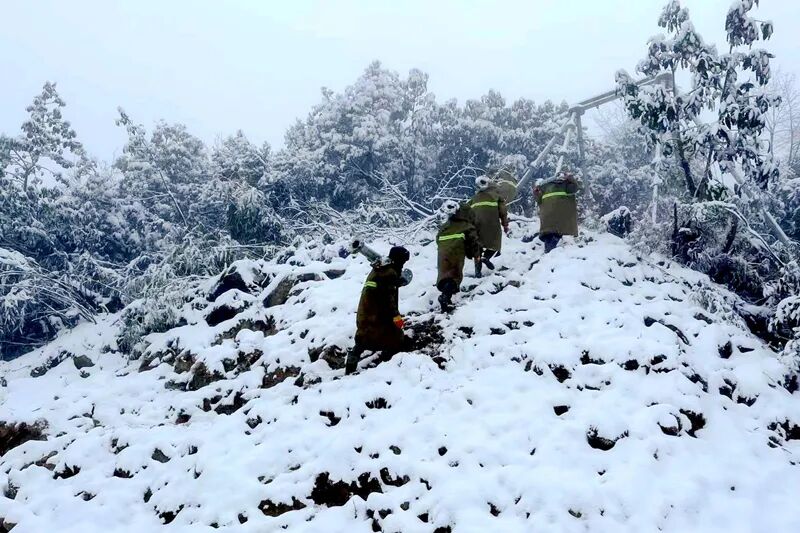 ▲国网四川电力员工踏雪搬运索道龙门架材料