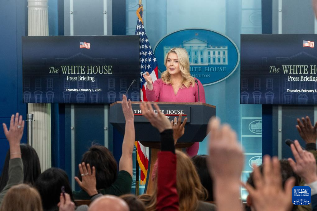 2月5日,在美国首都华盛顿白宫,白宫新闻秘书莱维特出席记者会。新华社发(李源清摄)