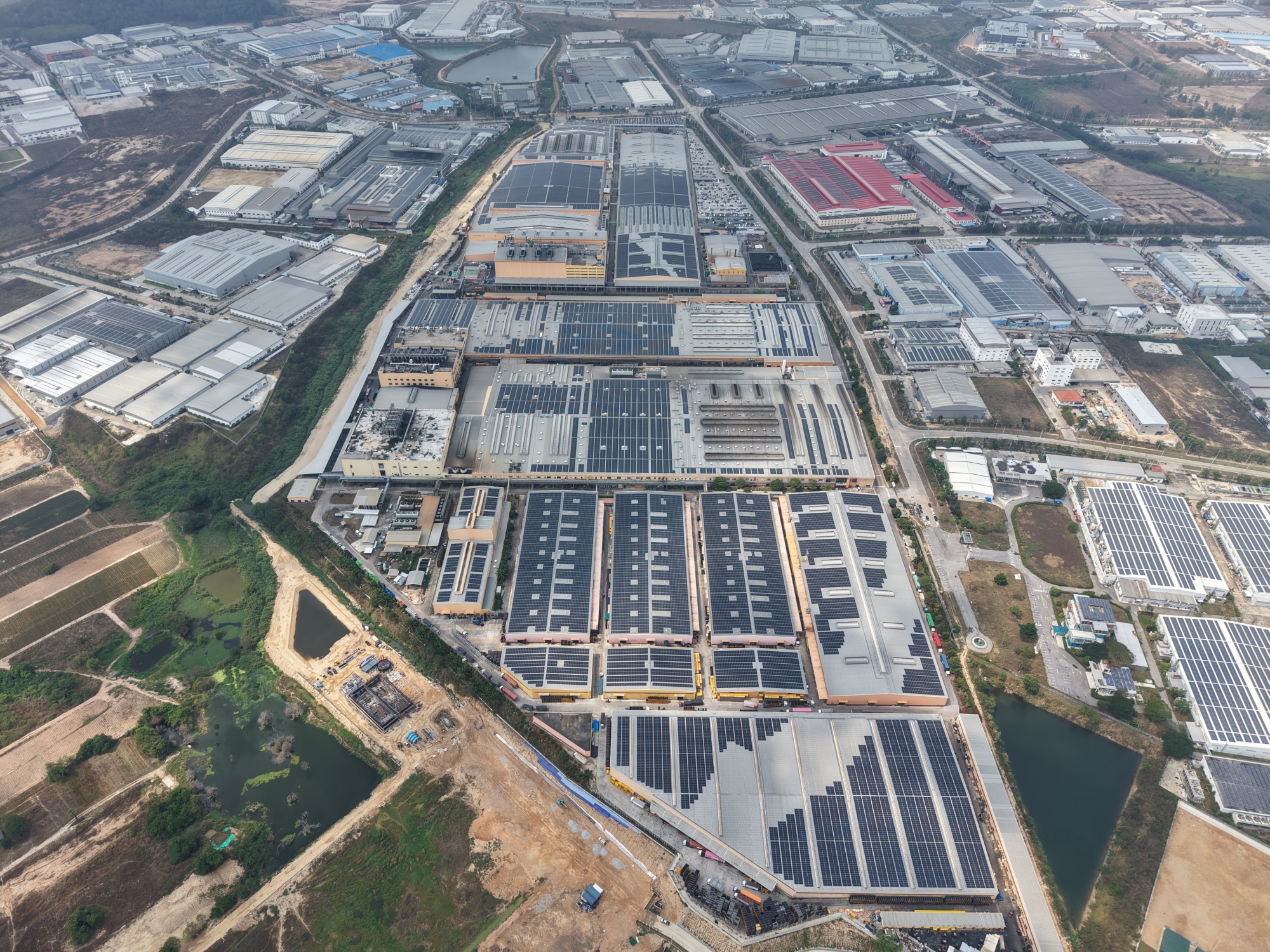 据悉,项目坐落于泰国罗勇府AMATA工业园区的中策橡胶工厂内,总覆盖面积约29万平方米,相当于40个标准足球场大小。工程覆盖厂区14个单体厂房的屋顶,共设置9个并网点,建设规模创下泰国工商业屋顶光伏项目新纪录。