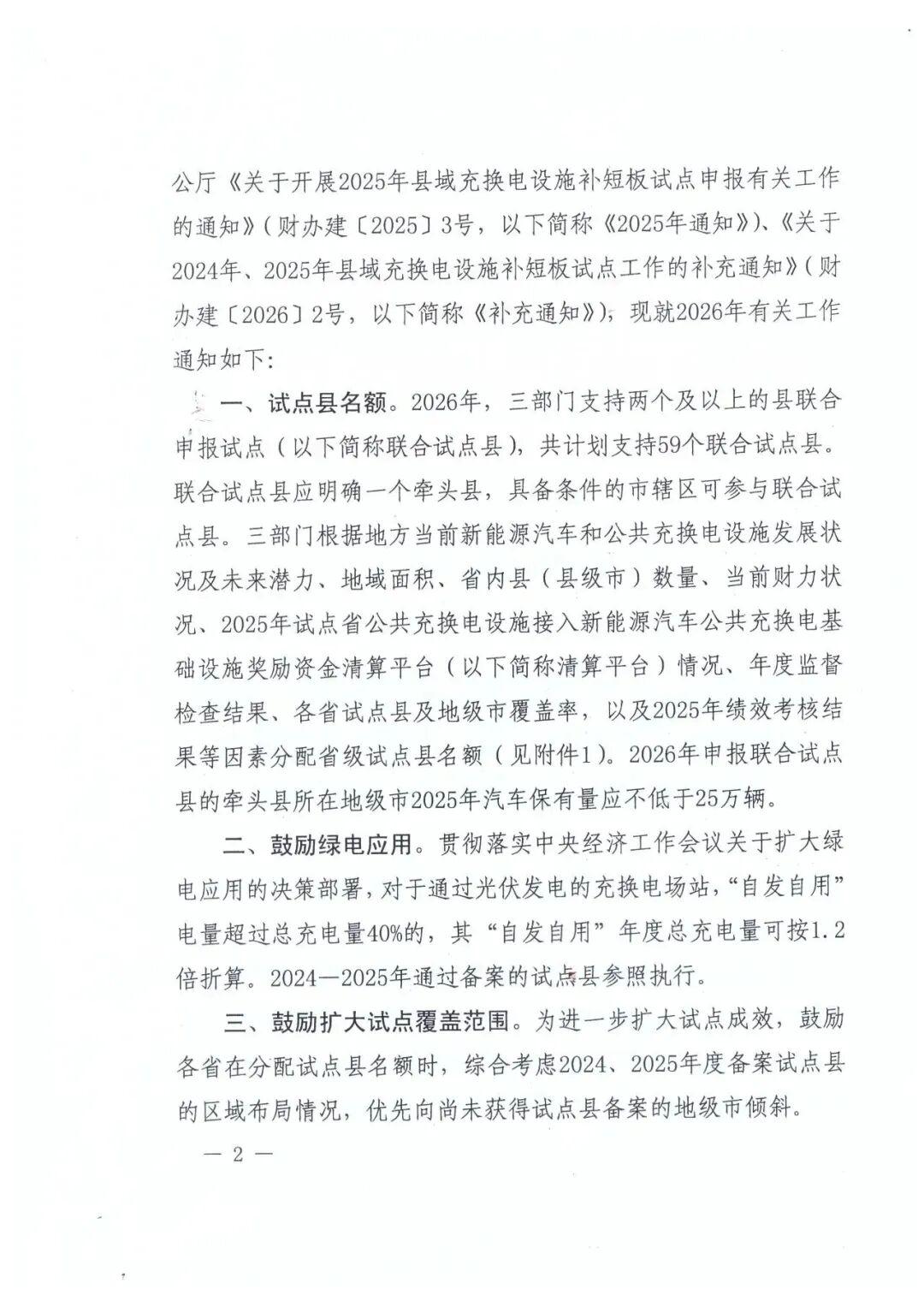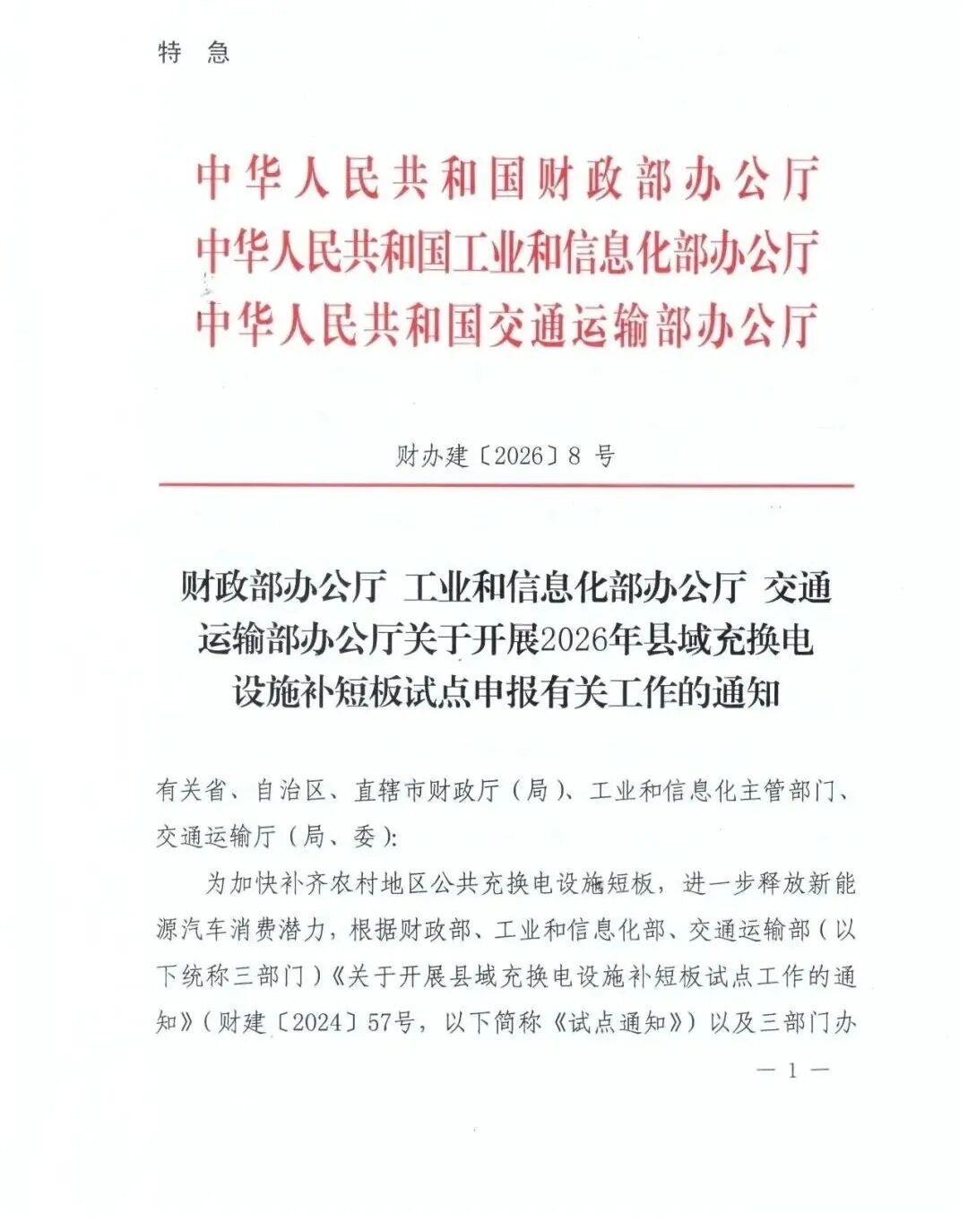 财政部、工信部、交通运输部三部门近日联合印发《关于开展2026年县域充换电设施补短板试点申报有关工作的通知》。