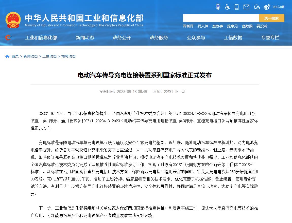 2023年9月7日,由工业和信息化部提出、全国汽车标准化技术委员会归口的GB/T 20234.1-2023《电动汽车传导充电用连接装置 第1部分:通用要求》和GB/T 20234.3-2023《电动汽车传导充电用连接装置 第3部分:直流充电接口》两项推荐性国家标准正式发布。