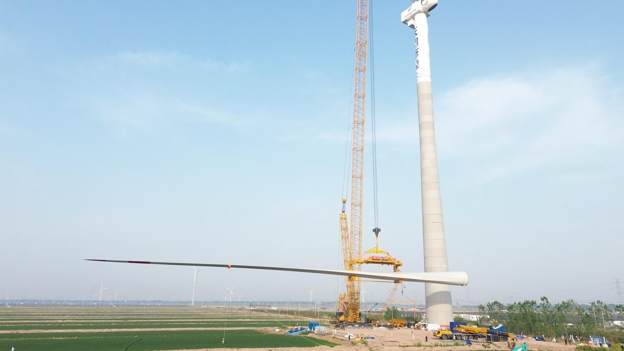 记者从中国铁建电气化局集团有限公司(以下简称中国铁建电气化局)获悉,4月20日中午,随着天润大丰风电项目最后一支叶片在155米高空完美“转体”与轮毂精准对接,我国自主研发生产的首台16.2兆瓦陆上单机容量最大发电机组顺利吊装完成。
