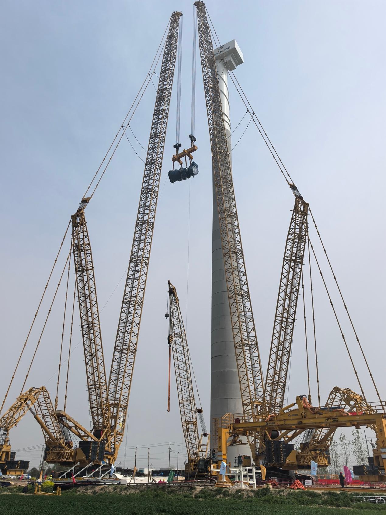 两台1250吨履带吊抬升风力发电机组传动链。
