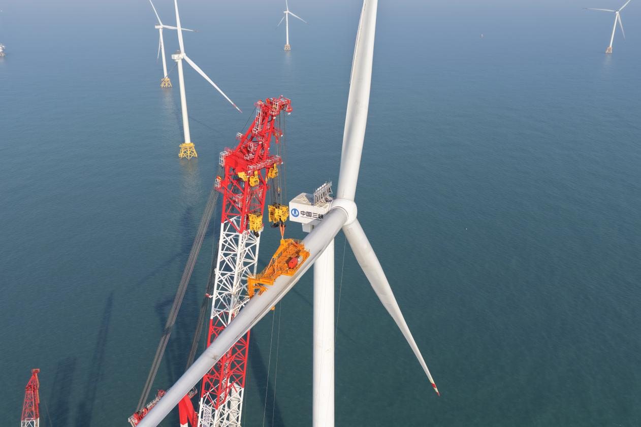 在大型起重装备的操控下,风机第三支叶片与机舱轮毂精准对接并完成螺栓紧固,标志着全球首台20兆瓦海上风电机组吊装作业顺利完成。(三峡集团福建分公司供图)