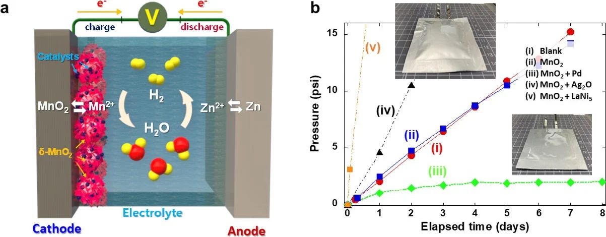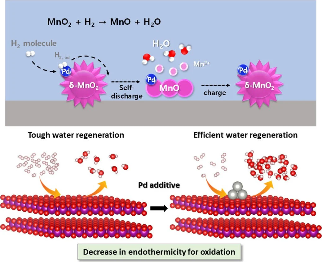 研究人员解释称,二氧化锰在正常情况下不与氢气反应,但当加入少量钯时,氢很容易被催化剂吸收,再生成水。在装载新开发的催化剂的原型电池中,电池的内压保持在远低于安全极限的水平,并且没有观察到电解质的消耗。