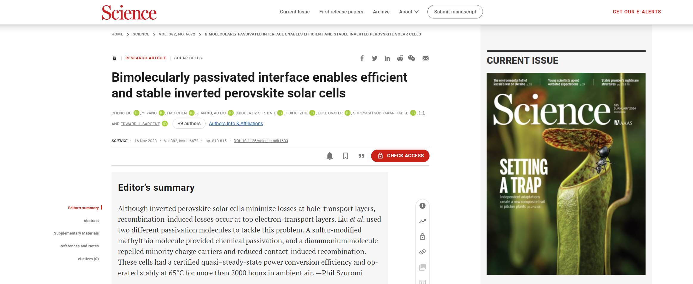 从历史上看,钙钛矿太阳能电池由于其相对不稳定,一直受到提高效率的挑战。在过去的几年里,Sargent的实验室和其他实验室的进步使钙钛矿太阳能电池的效率达到了与硅电池相同的范围。