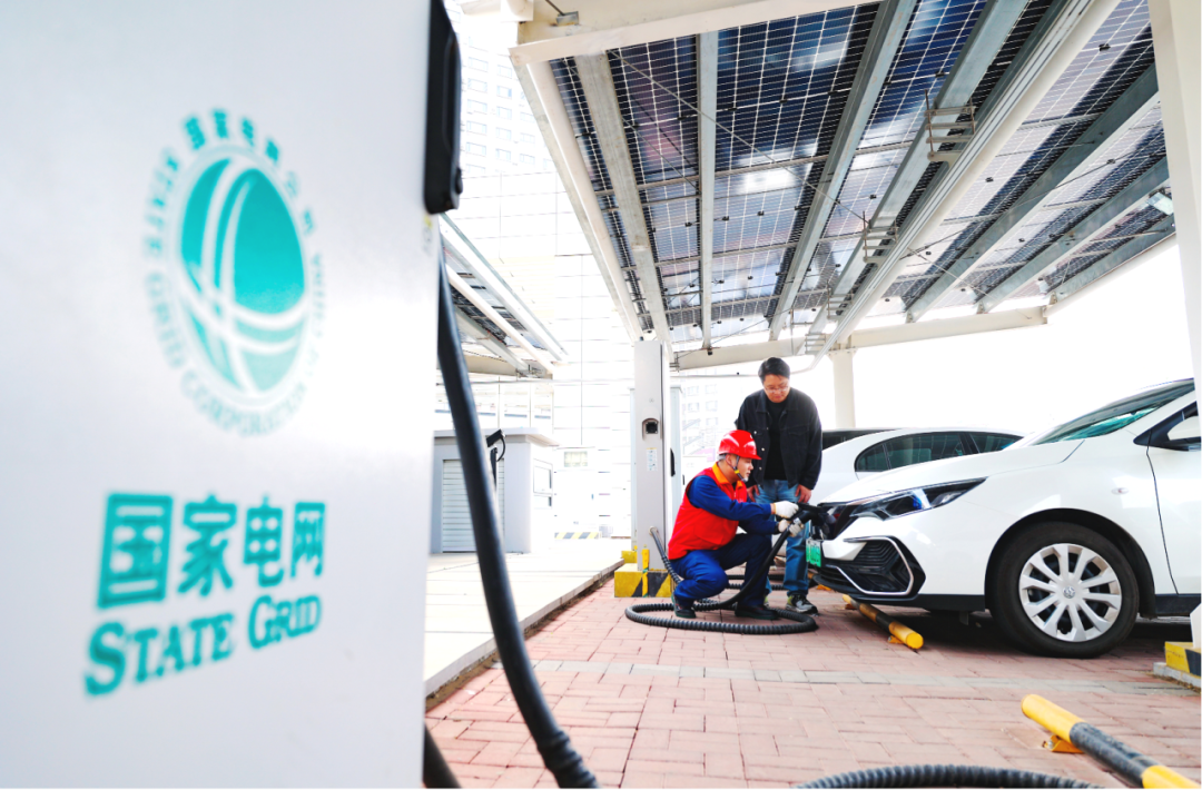 ▲国网天津电力员工在津门湖新能源车综合服务中心开展充电服务