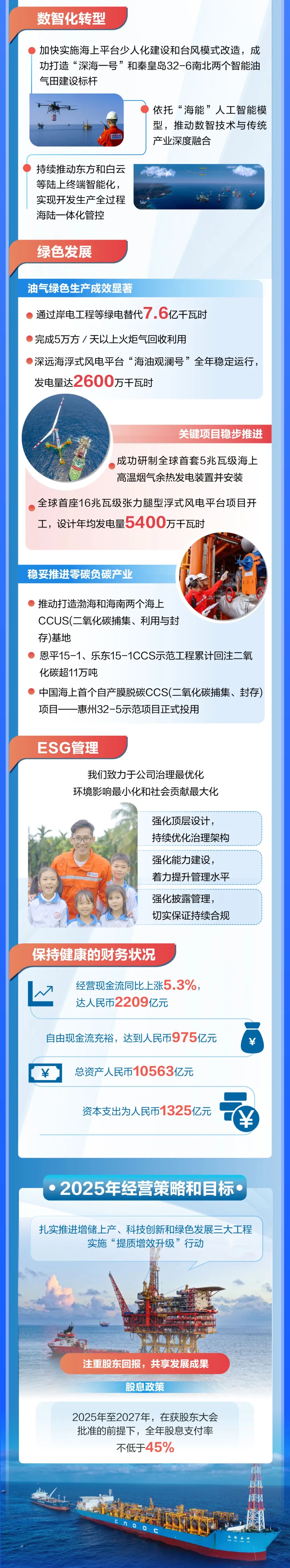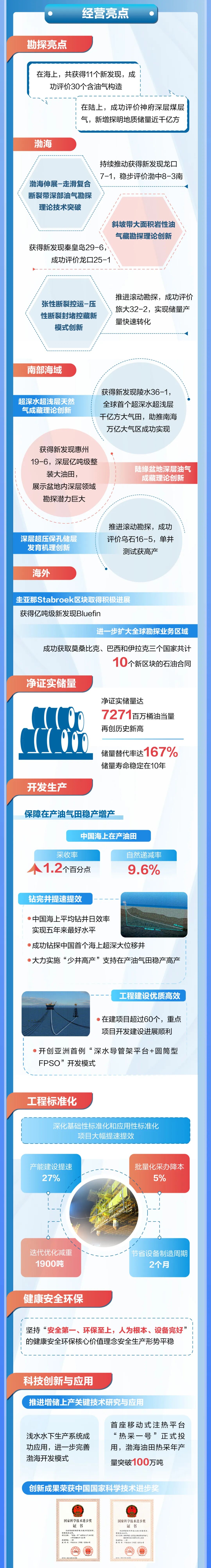 坚持可持续发展理念,注重生产安全,积极探索绿色转型路径。公司有效应对超强台风“摩羯”等挑战,确保海上油气田生产稳步运行。油气资源绿色低碳生产取得实效,中国海上首个全方位绿色设计的乌石23-5油田群建成投产,渤海岸电工程三期项目全面投用,全年通过岸电工程等共实现绿电替代7.6亿千瓦时。年内,全球首座16兆瓦级张力腿型浮式风电平台项目开工,设计年均发电量5400万千瓦时。与此同时,稳妥推进零碳负碳产业,大亚湾CCS/CCUS(二氧化碳捕集、利用及封存)示范项目扎实推进,积极打造渤海和海南两个海上CCUS基地。