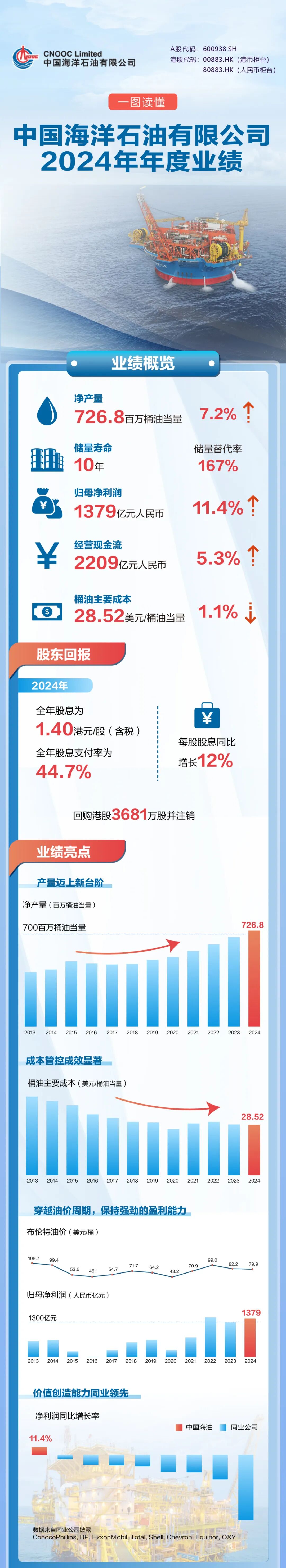 董事长汪东进表示:“2024年,我们以技术创新驱动增储上产,以成本优势筑牢发展根基,以稳定分红回馈股东信任。展望未来,中国海油将坚定不移地推进增储上产举措,实施提质增效升级行动,以实干实绩更好地回报股东,奋力谱写高质量发展新篇章。”