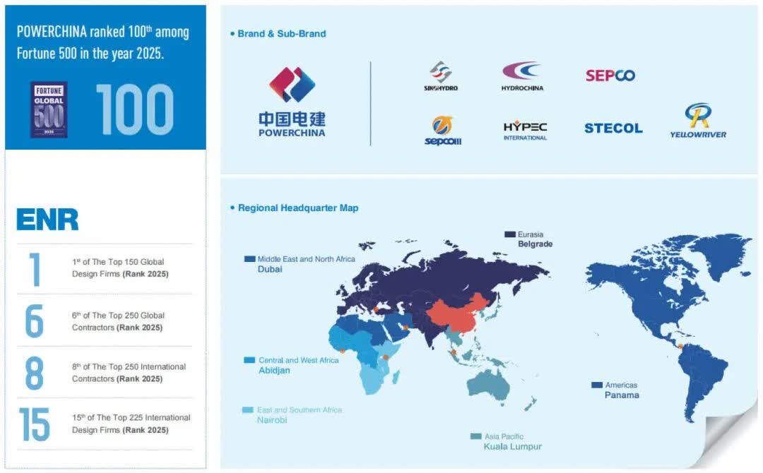 十年耕耘,硕果累累。公司国际业务新签和营收年复合增长率超6%,增速长期领先行业平均水平。“水能城数”及其他业务产业布局全面落地,境外电力、水利工程业务稳居中国企业第一,海外新能源业务长期位居行业榜首;2025年中国电建位居《财富》世界500强第100位,连续六年蝉联ENR全球工程设计公司150强榜首,在全球承包商250强和国际承包商250强中分别位列第6位、第8位,电力行业领域均居全球第一。区域市场布局上,在亚洲、非洲、中东、拉美四大核心区域全部跻身全球前六,其中中东市场位列全球第2、居中国企业之首,亚洲市场位列第3,非洲市场位列第4,拉美市场位列第6。