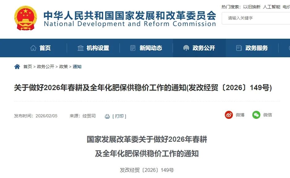 2025年,在各有关方面共同努力下,农业用肥需求得到有效保障。经商工业和信息化部、财政部、生态环境部、交通运输部、农业农村部、商务部、国务院国资委、海关总署、市场监管总局、中国证监会、国家网信办、供销合作总社,现就做好2026年春耕及全年化肥保供稳价工作通知如下。