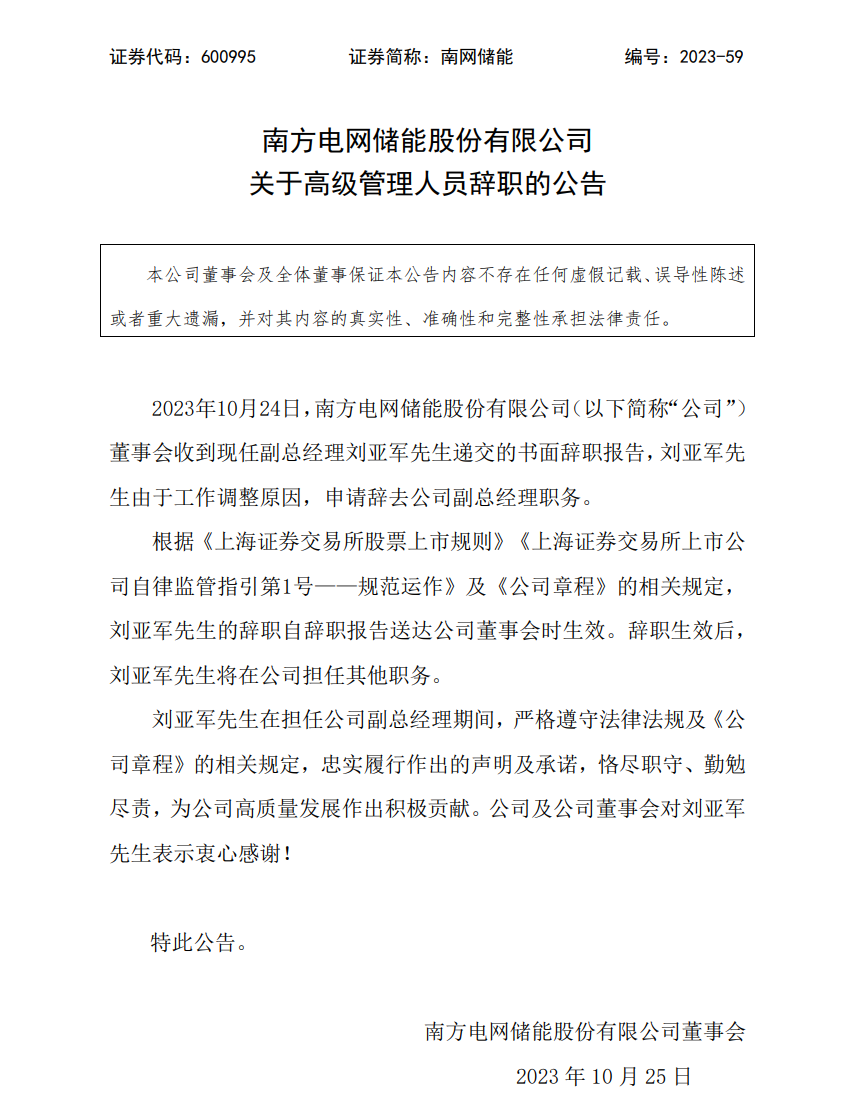 南方电网储能股份有限公司公告称,10月24日,公司董事会收到现任副总经理刘亚军先生递交的书面辞职报告,刘亚军先生由于工作调整原因,申请辞去公司副总经理职务。