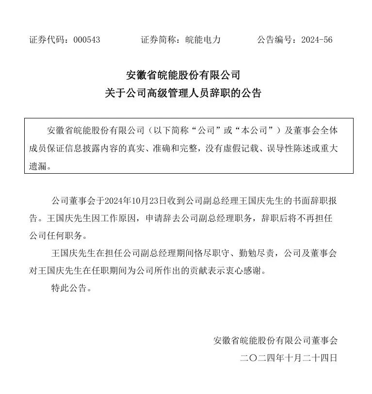 10月24日,皖能电力发布公告称,公司董事会于10月23日收到公司副总经理王国庆先生的书面辞职报告。王国庆先生因工作原因,申请辞去公司副总经理职务,辞职后将不再担任公司任何职务。