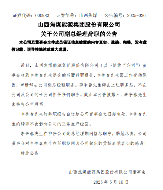 5月16日,山西焦煤能源集团股份有限公司发布公告称,近日,公司董事会收到李争春先生递交的书面辞职报告,李争春先生因工作变动原因,申请辞去公司副总经理职务。李争春先生辞去上述职务后,不在公司及公司的子公司担任任何职务。