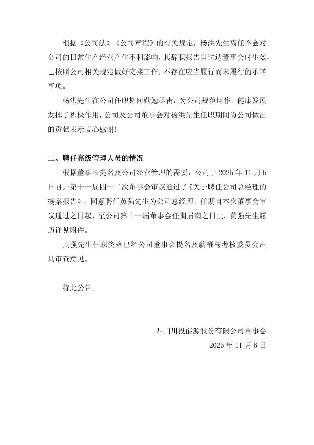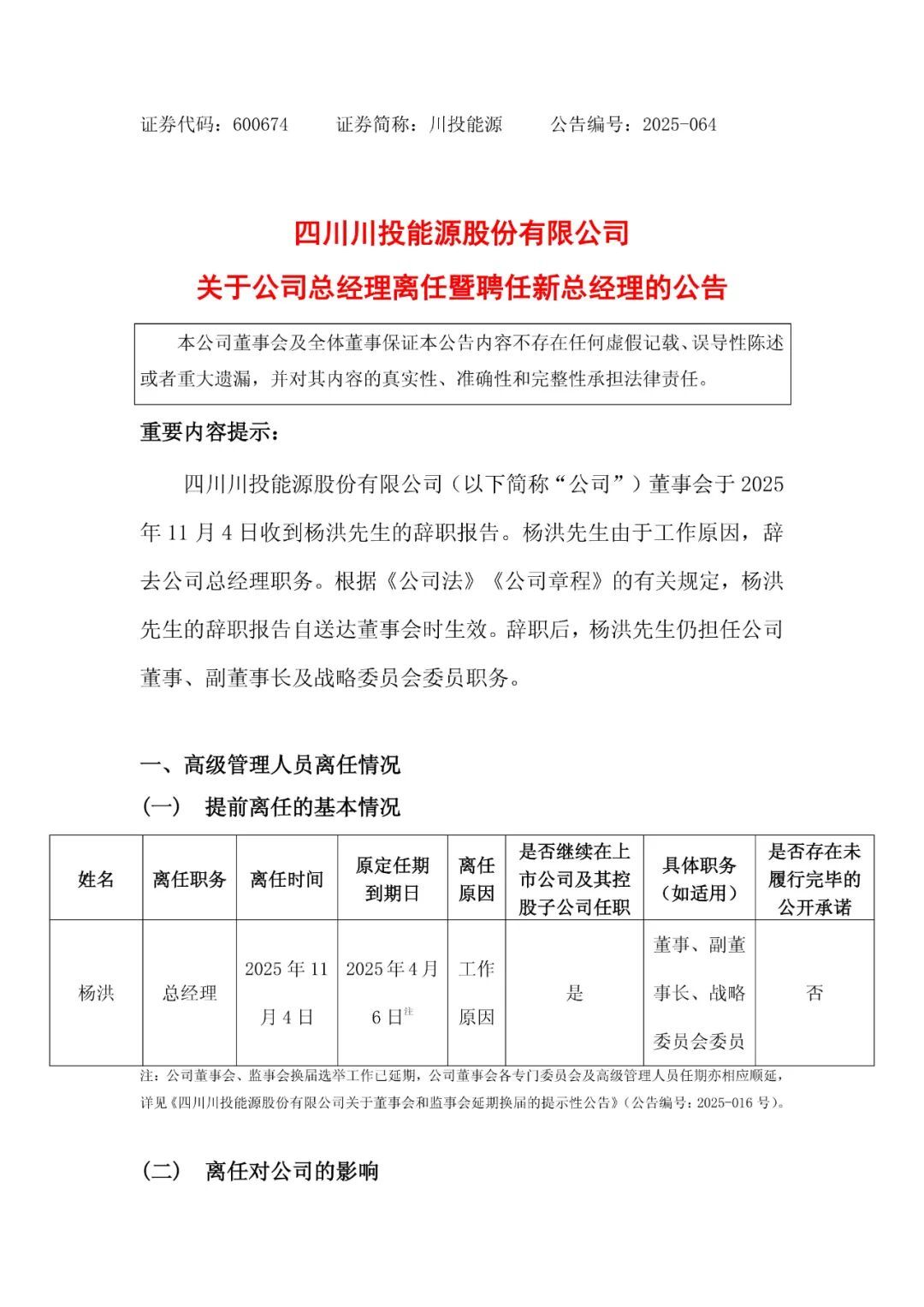 11月4日,川投能源发布公告称,公司董事会于2025年11月4日收到杨洪的辞职报告。杨洪由于工作原因,辞去公司总经理职务。辞职后,杨洪仍担任公司董事、副董事长及战略委员会委员职务。根据董事长提名及公司经营管理的需要,公司于2025年11月5日召开第十一届四十二次董事会审议通过了《关于聘任公司总经理的提案报告》,同意聘任黄强为公司总经理,任期自本次董事会审议通过之日起,至公司第十一届董事会任期届满之日止。