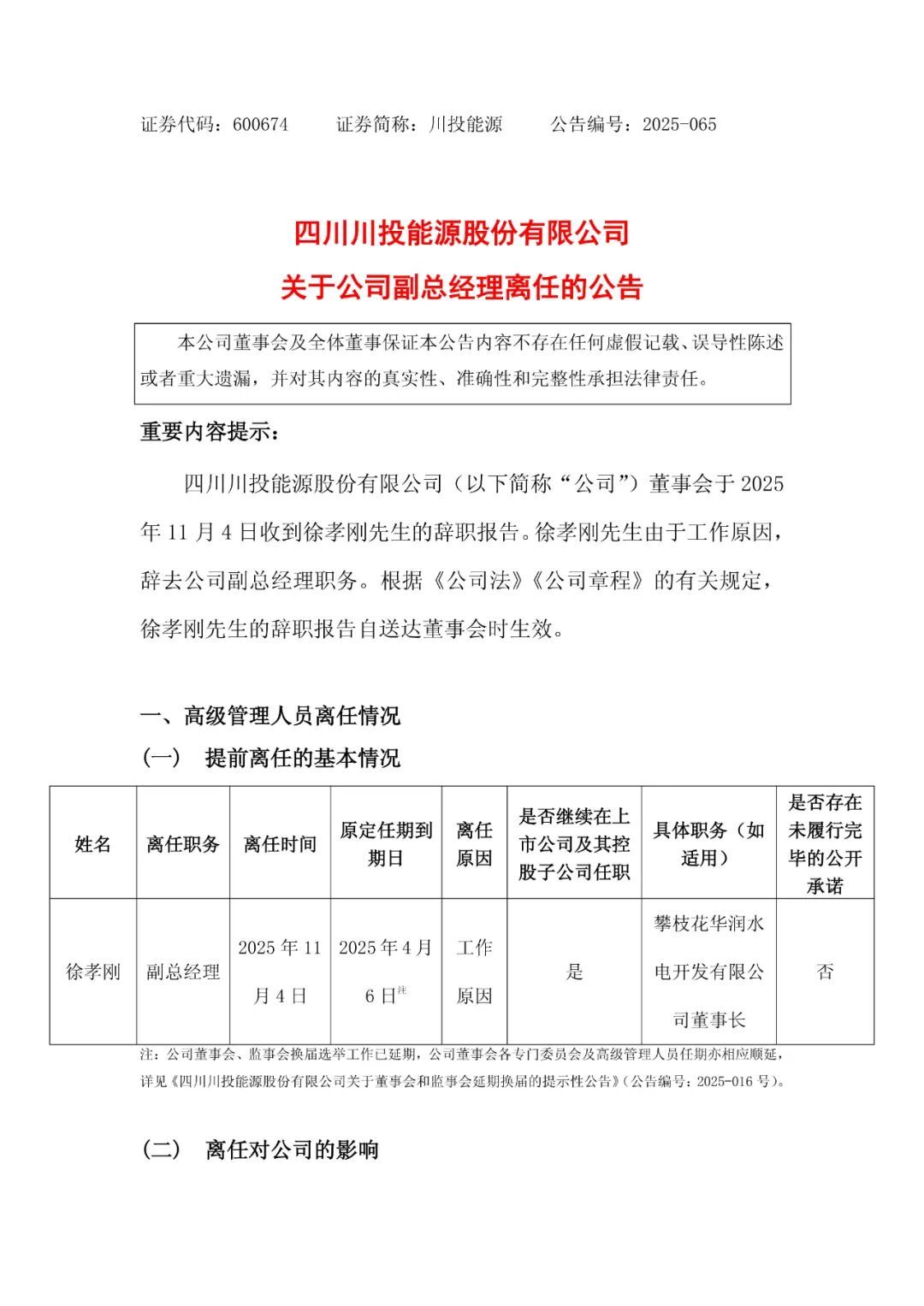 同日,川投能源公告称,公司董事会于2025年11月4日收到徐孝刚的辞职报告。徐孝刚由于工作原因,辞去公司副总经理职务。