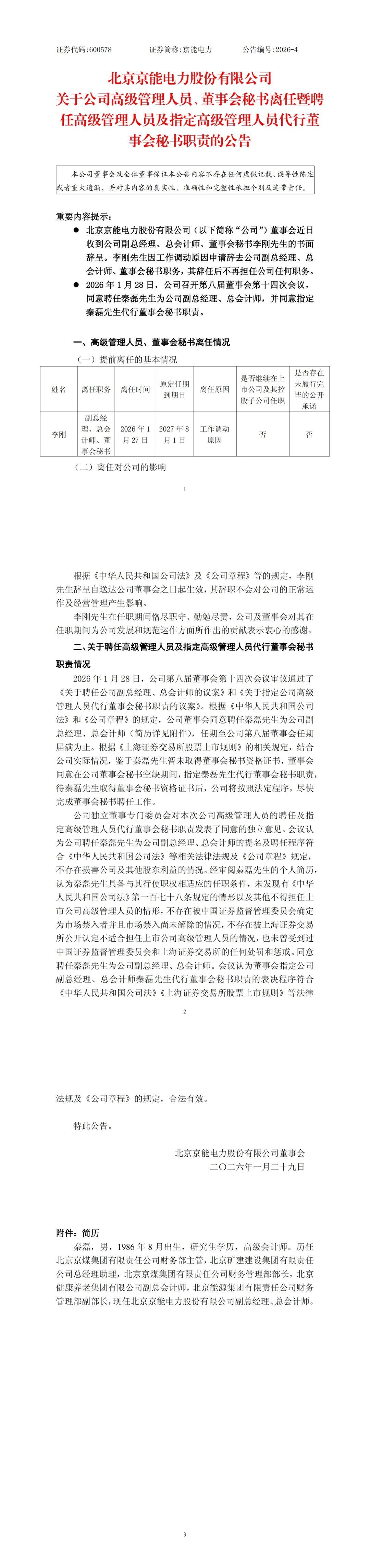 1月28日,京能电力发布公告,公司第八届董事会第十四次会议审议通过了《关于聘任公司副总经理、总会计师的议案》和《关于指定公司高级管理人员代行董事会秘书职责的议案》。