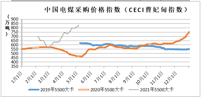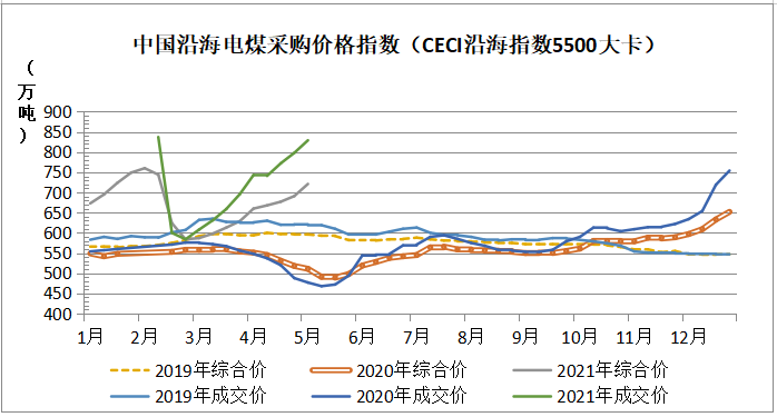 2021年4月29日至5月6日报告期内,中国沿海电煤采购价格指数(CECI沿海指数)综合价5500大卡报收于721元/吨,每吨上涨30元,涨幅4.3%;5000大卡报收于629元/吨,每吨上涨12元,涨幅1.9%。电煤市场采购成交价,5500大卡报收于829元/吨,每吨上涨31元,涨幅3.9%;5000大卡报收于714元/吨,每吨上涨13元,涨幅1.9%。国外经济复苏,叠加新冠疫情反复,我国出口预期持续向好;且进入5月“迎峰度夏”即将来临,工业用电叠加居民用电,专家预测今年迎峰度夏期间我国电力需求将保持较快增长。而电力企业虽不愿随高煤价起舞,但当前进口煤干扰因素仍存、补充作用不足的情况下,不得不采购高价煤补库,成本一路飙涨。