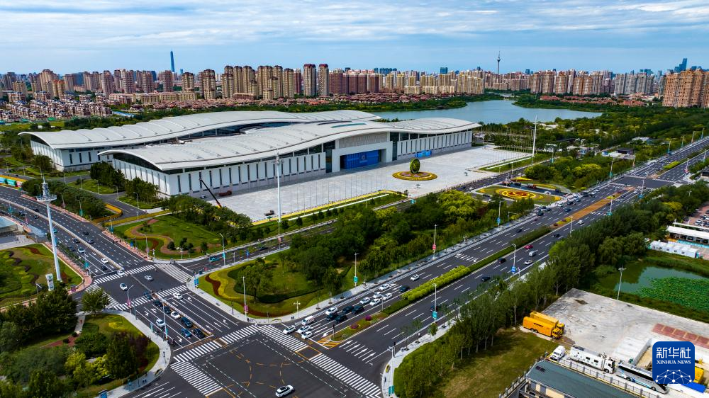 这是8月28日拍摄的天津梅江会展中心一景(无人机照片)。新华社记者赵子硕摄