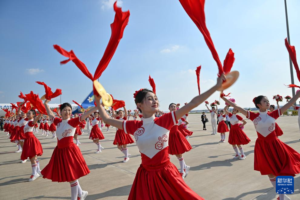 8月31日,工作人员在天津滨海国际机场迎接参加峰会的嘉宾。新华社记者孙凡越摄