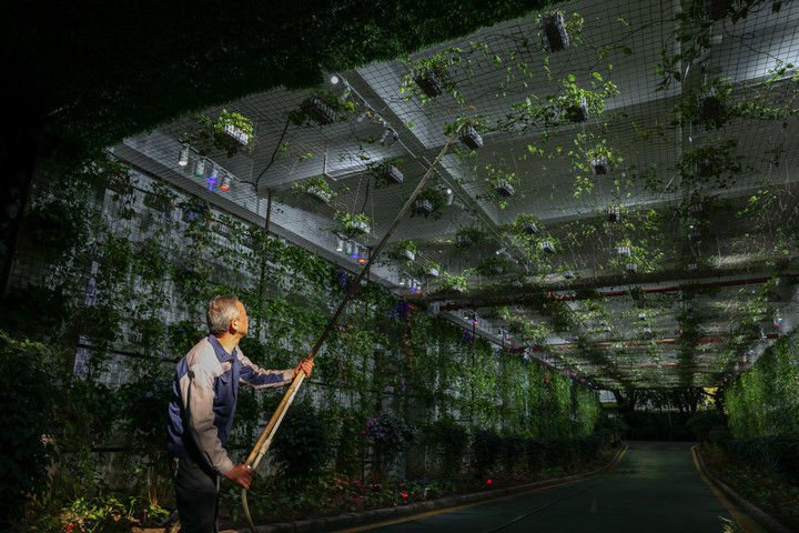 2025年4月2日,员工在位于深圳龙岗区坪地街道冠旭电子深圳总部的园区里给绿植浇水。