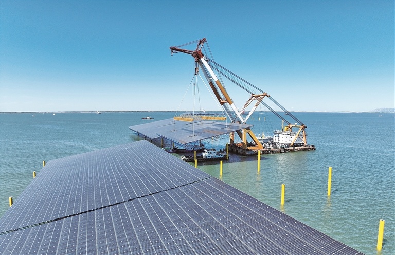 河北省昌黎县海域光伏发电场建设工地的机械设备在施工中。新华社发