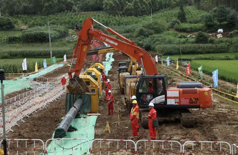 在宽阔的作业带上,几台挖掘机正在施工,巨大的沟槽逐渐成型,两侧整齐地堆放着防护用材料和即将铺设的管道。自2024年8月开工建设以来,这项工程综合进度已超50%,焊接里程突破263公里,预计2026年全面建成并具备投产条件。届时,将全面实现“桂气入滇”。