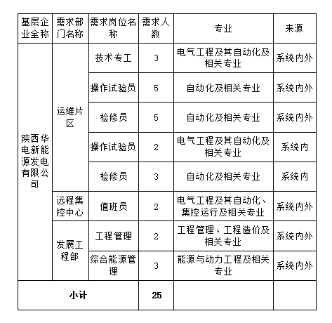 陕西华电新能源发电有限公司(简称“新能源公司”)成立于2011年,主要负责华电在陕的风、光新能源项目的开发、建设、运营与管理。截至2025年2月底,已投产装机容量2751MW(其中:风电1137MW,光伏1614MW)。为满足项目发展和生产运营需要,现面向华电系统内外开展公开招聘工作,现将有关招聘事项公告如下(根据华电新能委托,新能源有关岗位人员由区域公司招聘):