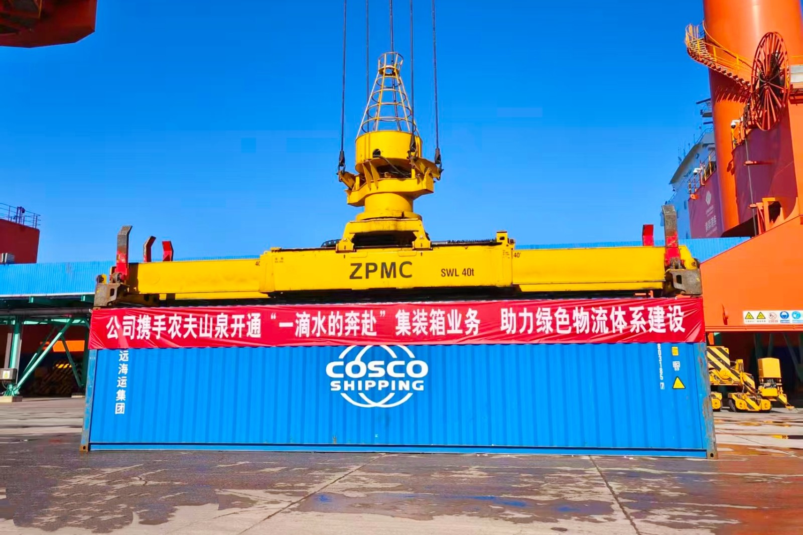 作为黄骅港务构建高效多式联运枢纽的重要抓手,“双钟摆”运输模式通过“铁路—海运—公路”无缝衔接,实现货物在锦州港、黄骅港间的双向高效流转。此次试点货类为农夫山泉旗下靖宇工厂、临江工厂生产的优质天然矿泉水,全程采用“铁路—海运—公路”联运方式,货物经铁路从吉林长白山运抵锦州港,换装中远海40HQ集装箱后通过海运经天津港中转至黄骅港,最终通过公路运输直达华北市场,实现了从长白山到华北市场的“门到门”运输闭环。