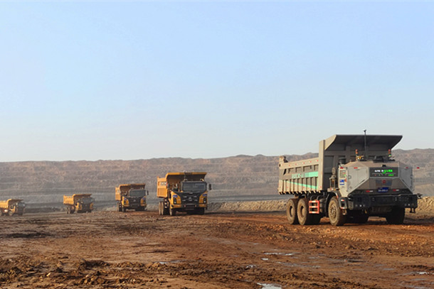 运输机器人带领无人驾驶矿卡奔驰采场。