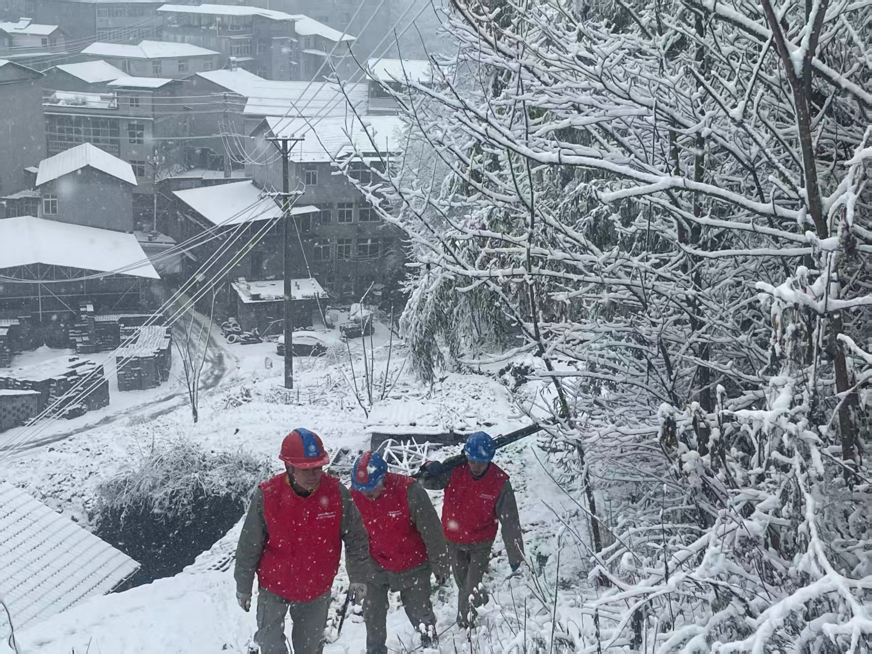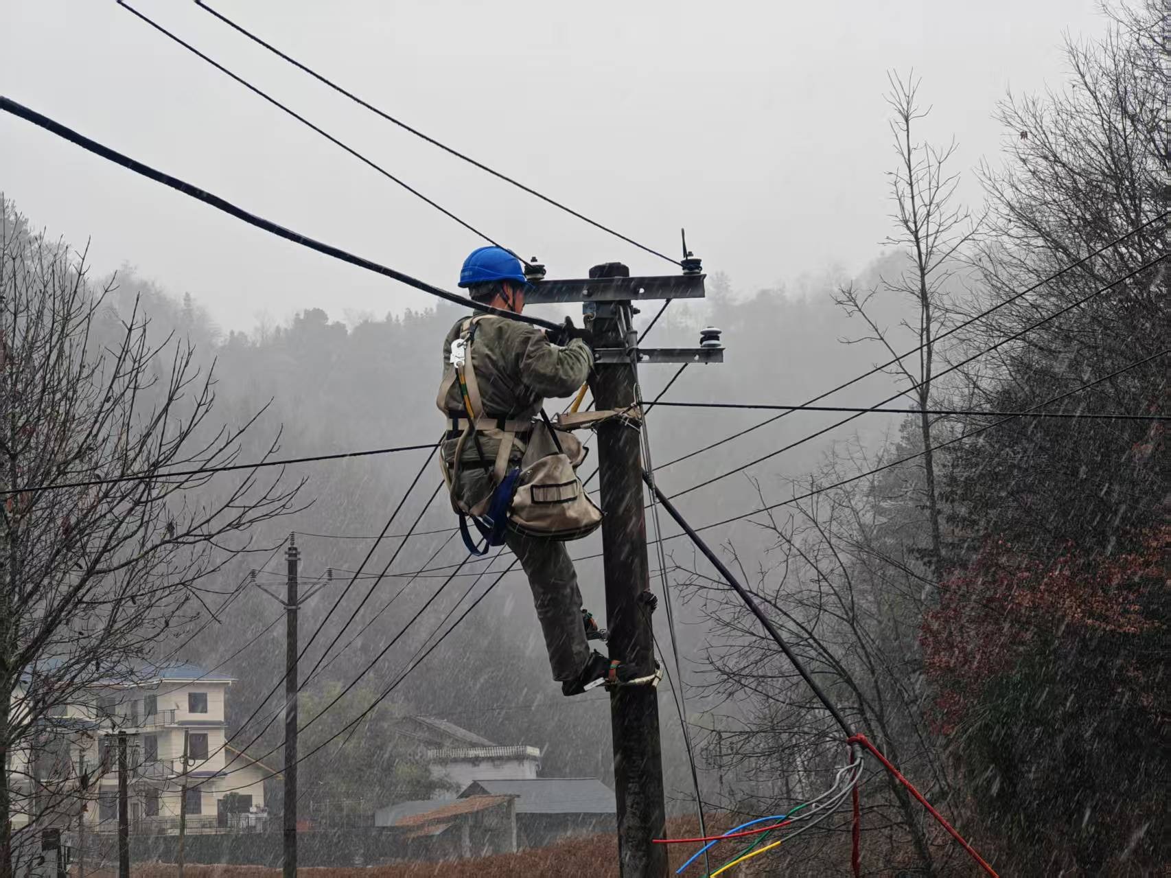 31日清晨,建始县官店镇后坪村,皑皑白雪中,一队头戴蓝色安全帽,身着“鄂电红马甲”的电力工人格外引人注目,他们踏雪行走在崎岖不平的山路上,沿10千伏官红线照京坪六组公变线路开展特巡。队员们在山林小路互相搀扶踏雪前行,完全不顾风雪浸袭,逐杆对导线、金具和绝缘子积雪覆冰情况进行仔细检查,对转角拉线进行加固,并在行进过程中对线路附近折断倒伏的树木枯枝进行处理,不放过任何一处细节,全面排除隐患缺陷。而在海拔较低的红岩镇,红岩供电所员工汪启雄、欧阳青昀等冒雪登杆为百草池公变用户更换进户线,完全顾不上艰难和寒冷。