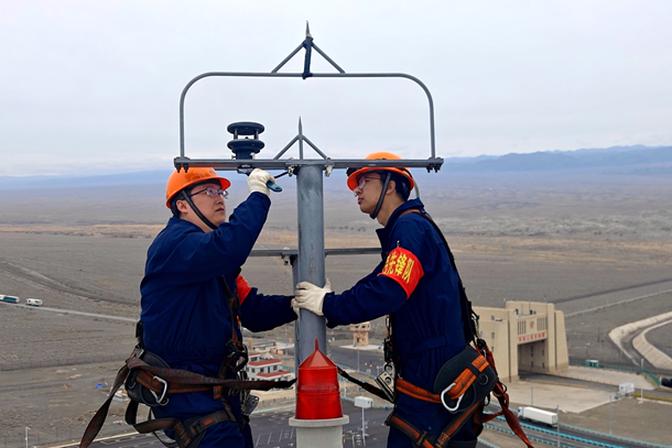 图为新疆电力龙源新能源党员检修风速仪和风向标。