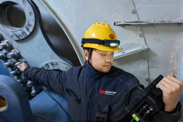 图为新疆电力员工开展螺栓超声波探伤测量工作。
