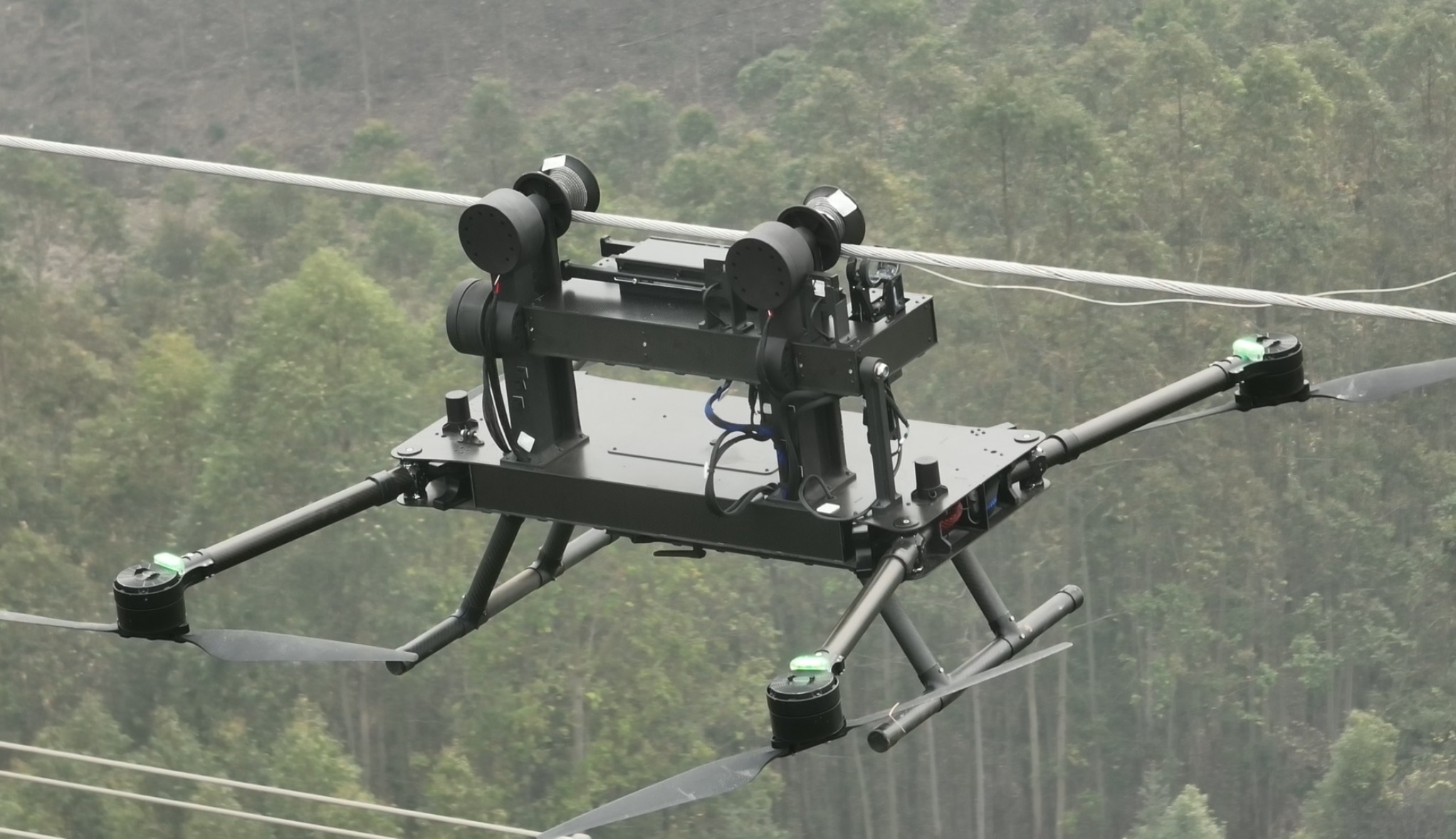 在现场,指令下达后,“机器人”飞抵指定位置,稳稳降落在光缆上并开始自主巡行。锁定损伤点后,它利用机械臂捋顺散开的金属丝,底部的捆扎装置同步动作,为光缆打上坚固的“外科夹板”。从上线、寻位、修复到自主脱离返航,整个过程一气呵成。