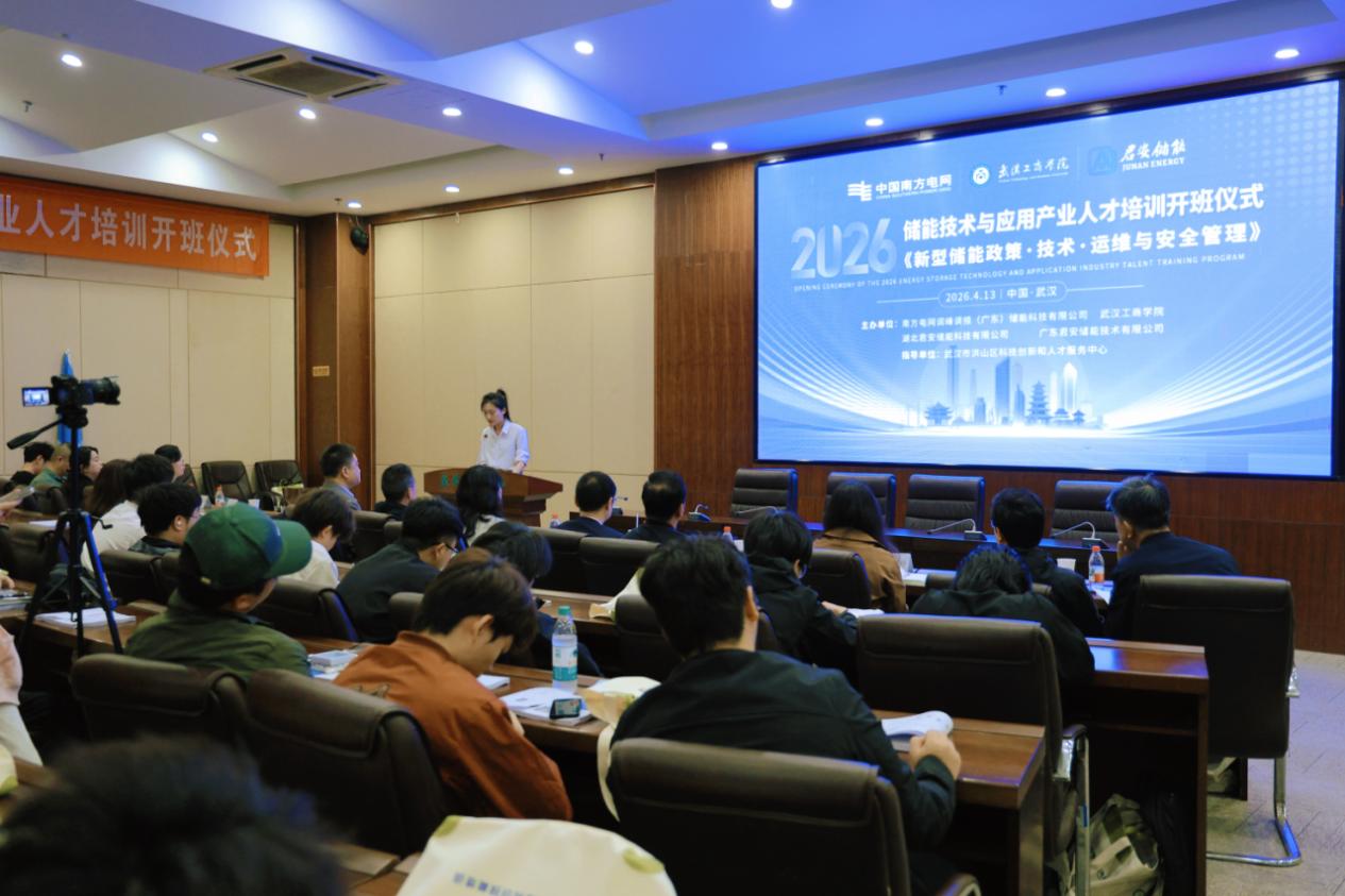 中国能源新闻网讯(王蕾)4月13日,2026年储能技术与应用产业人才培训班(理论)开班仪式在武汉工商学院顺利举行。本次培训得到工业和信息化部人才交流中心的支持,由武汉市洪山区科技创新和人才服务中心指导,南方电网调峰调频(广东)储能科技有限公司(以下简称:南网储能科技公司)、武汉工商学院、湖北君安储能科技有限公司、广东君安储能技术有限公司联合主办,并获得工业和信息化部人才交流中心武汉办事处支持,来自武汉工商学院的首批30余名学员参训,以“理论+实操”双轨模式,培育储能实战型人才,推动政校企协同、产才深度融合。