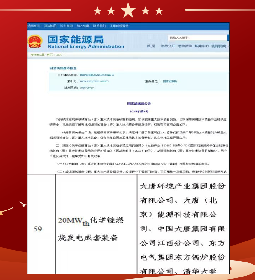 中国能源新闻网讯(杨言 范长丽)近日,“20MWth化学链燃烧发电成套装备”正式入选能源领域首台(套)重大技术装备名单,此次入选是企业在科技成果转化进程中实现跨越式发展的重要机遇,标志着国家对企业科技创新能力的高度认可。本次全国共有82项技术装备列入该名单。