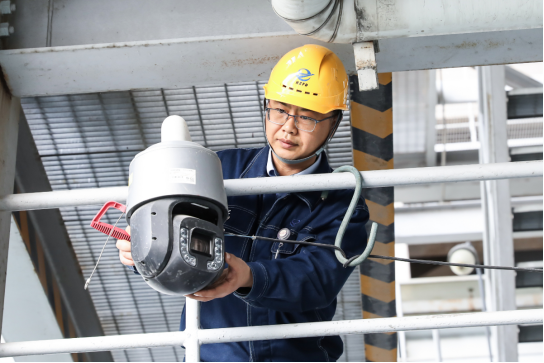 凤电公司信息技术人员检查检修现场5G摄像头。王善战 摄
