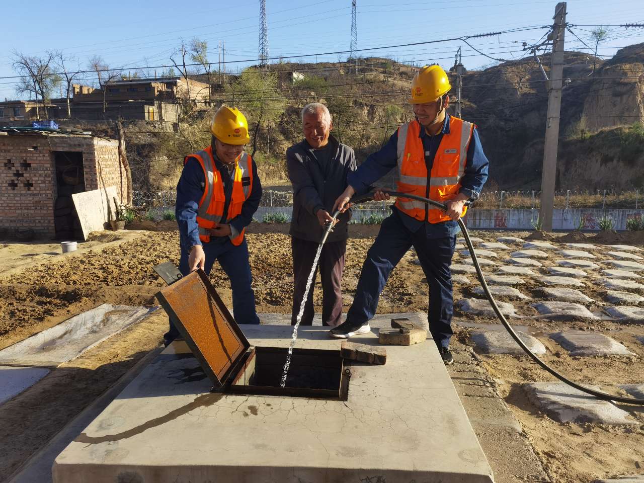 党员们一边抽水、倒水,一边细心叮嘱:“大娘,以后用水有困难,随时给我们打电话,这最后一百米的安全,我们来守护!”