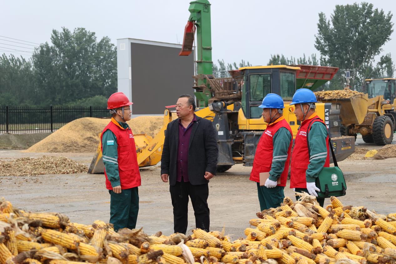 国网商河县供电公司党员服务队员正在所辖粮食烘干企业协助客户检查用电设备运行情况。