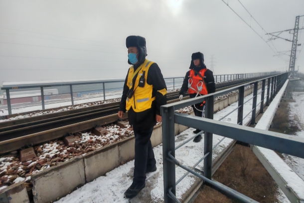 “停止作业,正线来车,避车台避车!”对讲机里传来防护员金自军的提醒。大家迅速退至安全避车点,却仍紧盯过车时桥体状态。不一会儿,一列检修作业车缓缓通过,桥梁在载荷作用下轻微震颤,风压裹着雪粒扑面而来。作业车驶离后,现场又归于宁静,有着十几年桥梁守护经验的侯桂兴不禁感叹:“每一次列车平稳通过,背后都有我们多走的一步、多看的一眼、多敲的一锤。”