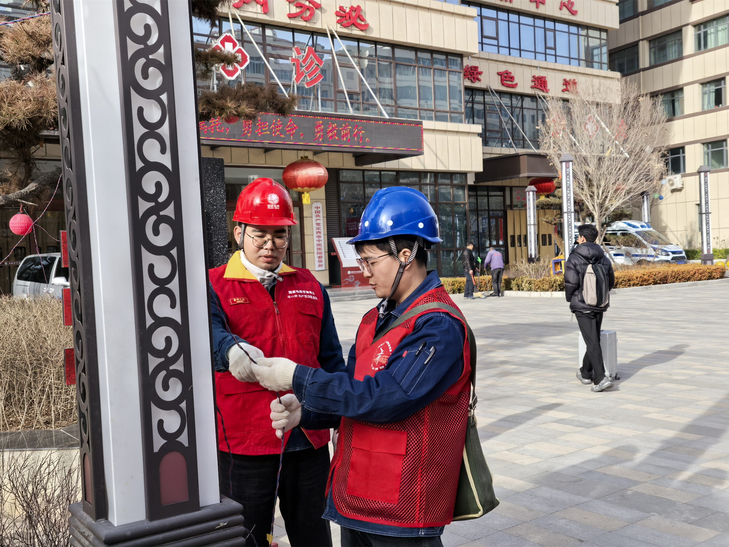 国网定西市安定区供电公司共产党员服务队、青年志愿者为中医院排查安全用电隐患。