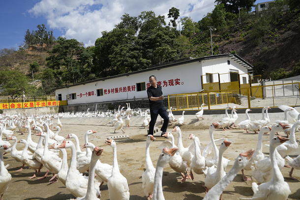 红军树的山脚下,680亩特色水果种植区连片成园、生机勃发,3万余株白肉枇杷、蜂糖李等优质果树整齐排列、长势喜人,先进的水肥一体灌溉系统精准滴灌,让曾经的旱地荒山披上绿装、结出硕果。山间鹅鸣嘹亮,循声而去,一座现代化的智慧养鹅场坐落有秩,场区通过引入东南沿海优质鹅种和先进的养殖技术,规模化养殖水平与产业效益不断提升,累计出栏大白鹅15000余只,村集体经济持续壮大。