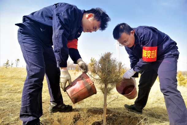 进入5月,张家口坝上春寒料峭,吉风风电场员工们扛起铁锹、拎着樟子松树苗,踩着刚复苏的冻土走进场站周边的荒滩,延续着一场持续十五年的“绿色接力”。