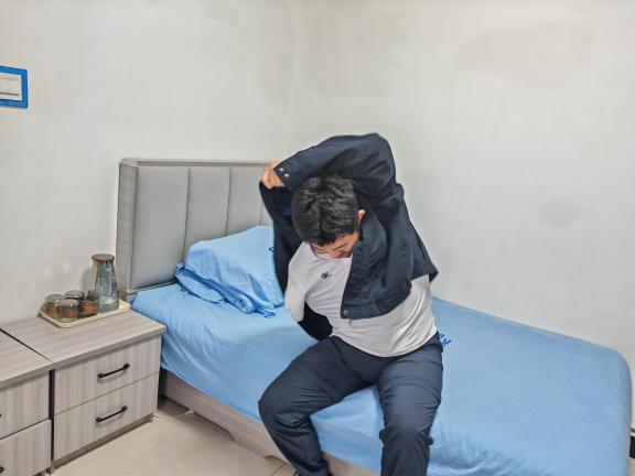 狼狈不堪的生活日常:在模拟生活场景中,单腿穿脱裤子、单臂穿衣等简单动作变得笨拙无比,常常因难以保持平衡导致摔倒在床上,深切感受生活自理能力的丧失。