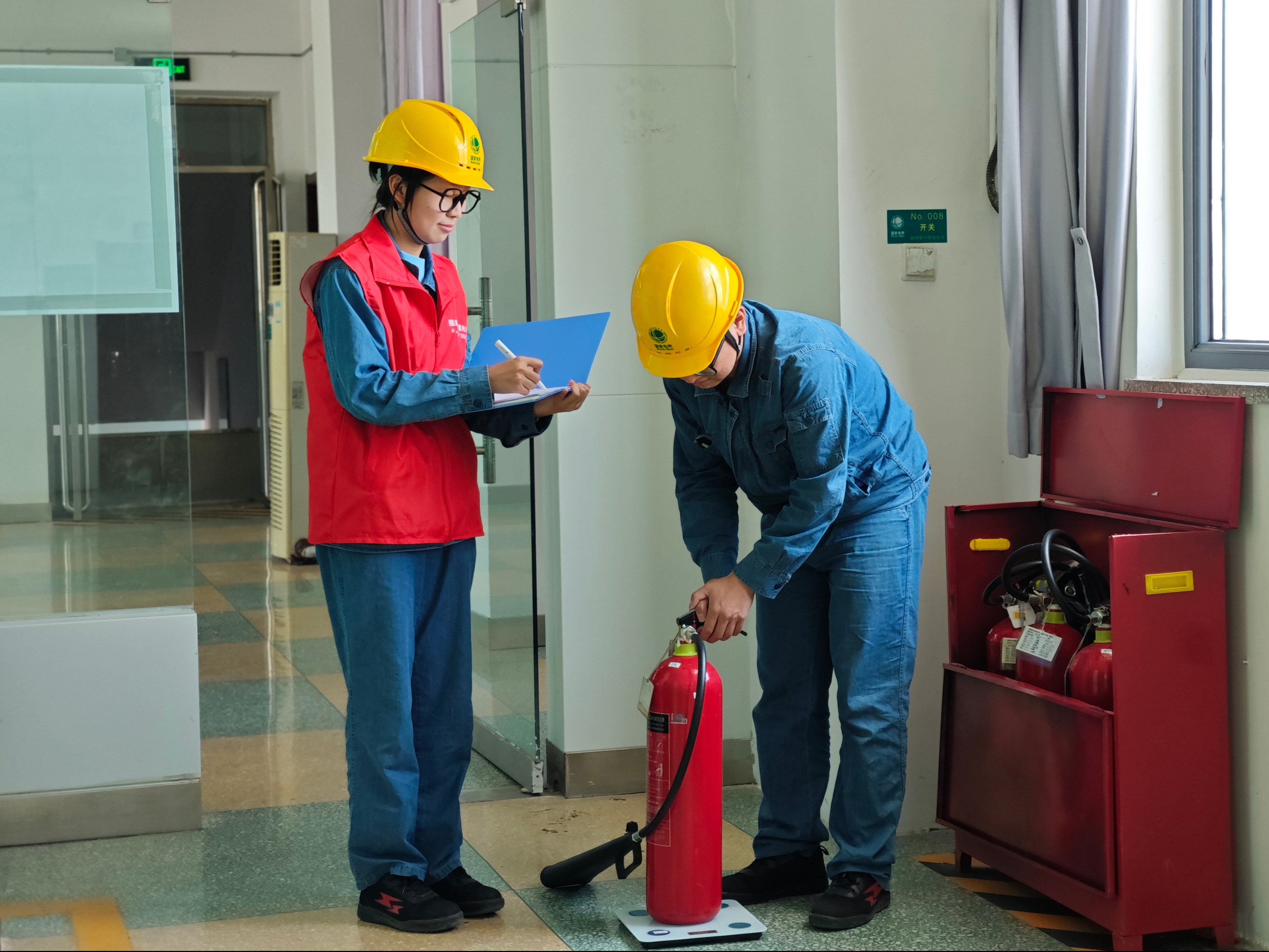 6月5日,国网银川供电公司变电运维中心值班员黄嘉磊和王予希在掌政220千伏变电站开展灭火器隐患排查,利用称重法检验二氧化碳灭火器的泄漏量。(康文姣)