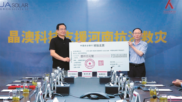 7月23日,晶澳太阳能科技股份有限公司(简称“晶澳科技”)通过北京市慈善协会向河南省捐赠1000万元人民币,用于支持当地抗洪救灾和灾后重建工作。晶澳科技以“开发太阳能,造福全人类”为使命,截至目前,晶澳科技累计向社会捐款捐物近亿元,累计向社会捐赠和提供扶贫款项超过5000万元。